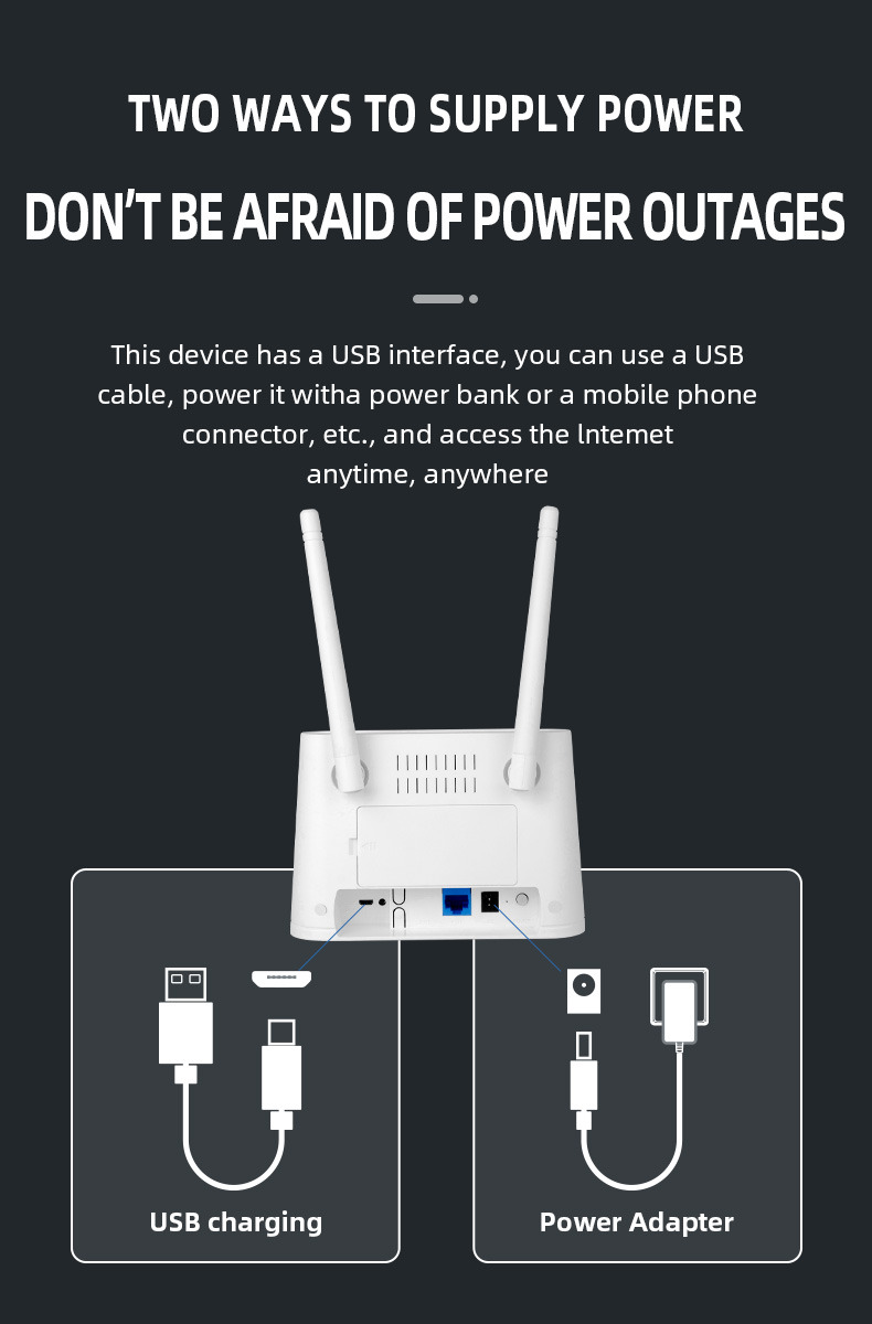 محصول LTE Router Volte همچنین با یک منبع برق 12V DC ، 1A عرضه می شود ، که آن را انرژی کارآمد و مقرون به صرفه می کند.شما مجبور به نگرانی در مورد صورتحساب برق بالا و یا هدر دادن انرژی با این روتر نیست.